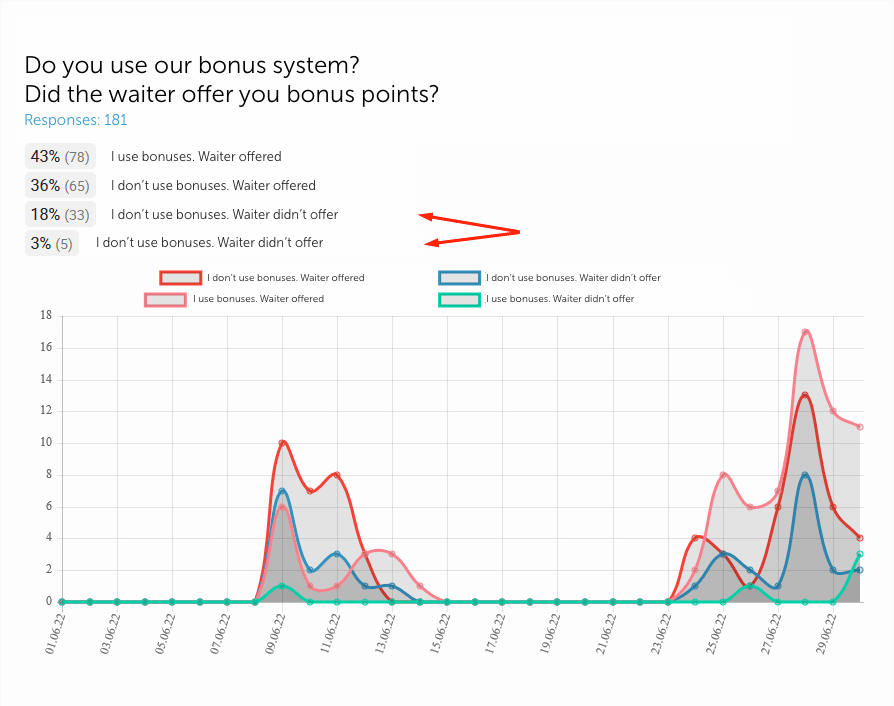 2. Here is what has been done for the service. The main thing — waiters remembered all our promotions in the restaurant, the bonus system, and how it works. There is simply no way left to not tell about the promotion or bonuses when a guest takes the survey. For example, here are the statistics: